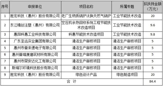 据公示附件“2021年惠阳区节能专项资金项目拟安排表”内容,获得嘉奖的项目共有三个专题类别,分别为:工业节能技术改造、清洁生产审核项目和绿色制造项目,分别有3项目、5项目和1项目。其中z6com尊龙凯科技(惠州)股份有限公司的老厂生物质锅炉汰换天然气锅炉,东江精创注塑(惠州)有限公司的空压机余热回收系统工程节能技术改造项目等3项目为工业节能技术改造;z6com尊龙凯科技(惠州)股份有限公司的绿色设计产品为绿色制造项目;惠州普瑞康建筑材料有限公司、广东至远实业集团有限公司等5企业的清洁生产审核项目为清洁生产审核项目。